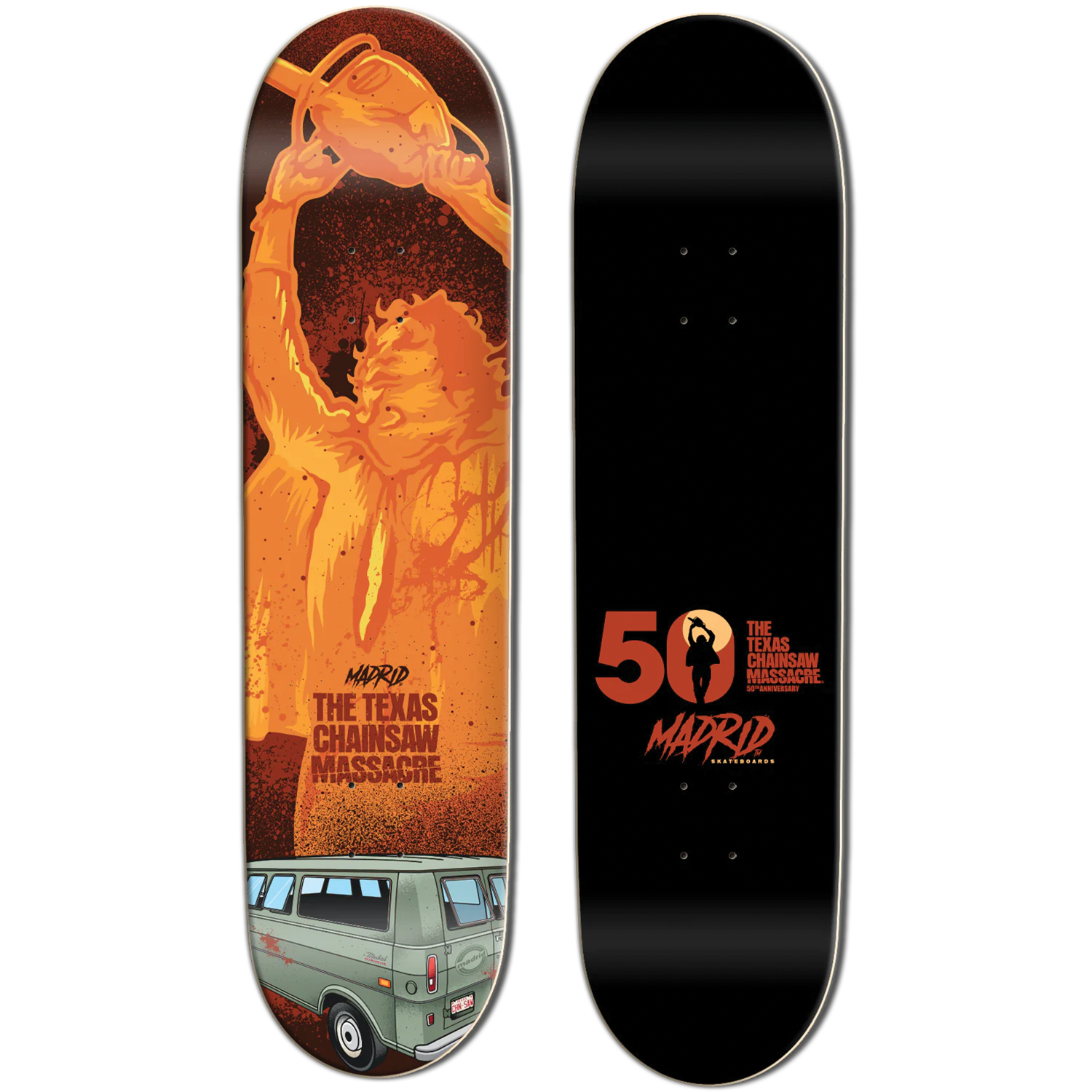 8.5" Madrid X Texas Chainsaw Massacre 50th Anniversary Sunburn Street Skate Deck This deck is perfect for both skaters and horror enthusiasts alike!